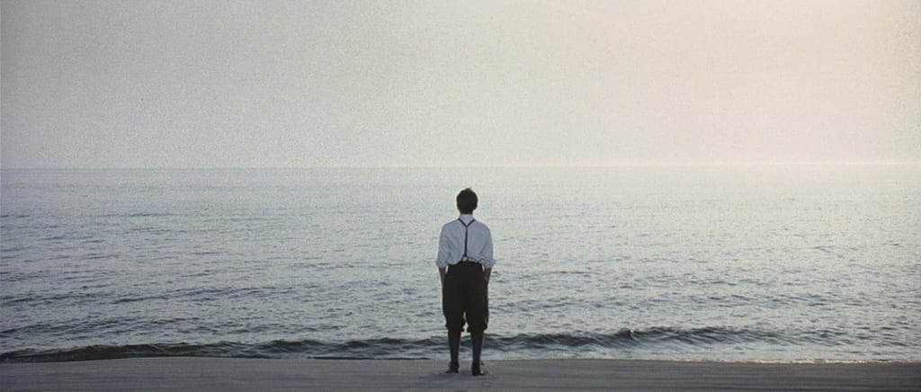 The morning ocean tide is high and the gentle waves pendulum up and down the darkened sand as a naked Thomas races down the front of a dune and launches himself into the water, disappearing beneath the surface. He emerges, standing in the waist high water, staring out at the horizon. The rising sun's long light path casts its golden glow, glistening on the unsettled ocean rooftop.
