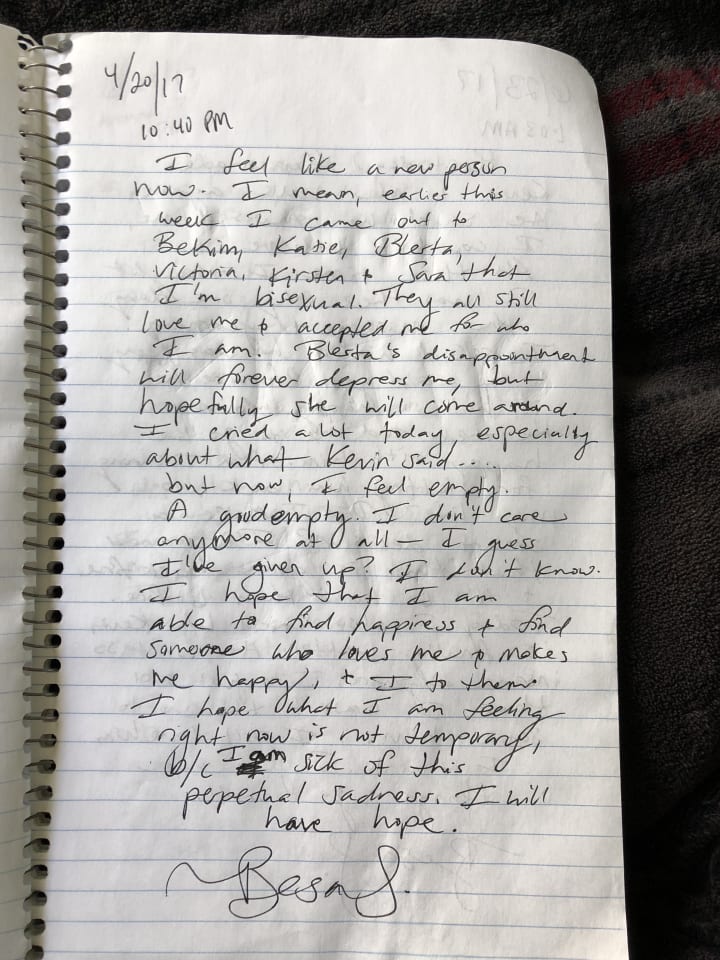 I also came out as bisexual on that day, that day that Kevin had hurt me. "Bekim" and "Blerta" are my siblings, and "Katie" was my brother Bekim's former fiancée. They were accepting, except for my little sister Blerta, who is just 2 years younger than me and had failed to understand how I could ever be attracted to girls. I told her, "Well, you don't have to understand. Can't you just love me for who I am?" And then I cried. For my sister's disapproval. And for Kevin.
