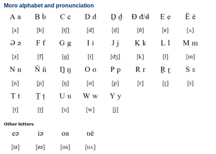 Moro is spoken in the Nuba Mountains region of South Kordofan state, Sudan. It contains seven dialects: Leyenia, Tobəɽelda, Uləba, Lənəbwa, Nḏërria, Ləmwarəŋ and Ləŋorəban. According to linguists, an estimated 25% of Moro vocabulary originated from Arabic.