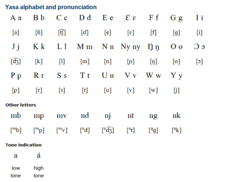 Yasa is a language spoken in Cameroon and Equatorial Guinea by the Iyasa and Ndowe peoples. It goes by several different names and has around ten dialects: Bweko, Vendo, Bodole, Marry, One, Asonga, Bomui, Mogana, Mooma, and Mapanga. In Cameroon, Yasa is threatened by the prevalance of French in everyday conversation. In Equatorial Guinea, it is threatened by Spanish.