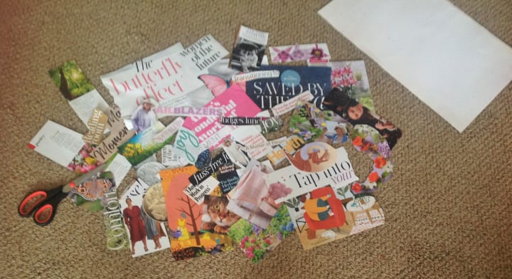Give yourself approximately one hour to quickly 'rip' pages from the magazines that have an appeal. Do this with little thought and use your intuition. This project has nothing to do with perfection or performance rather it is an experiential and expressive art form. Create one pile for your pictures and another pile for any letters, sentences, or phrases that you favor. It may be a good time for a break and/or snack. If you do this with a group of people, it is best to stay in your silence in order to allow for the free flow of ideas without interruption.