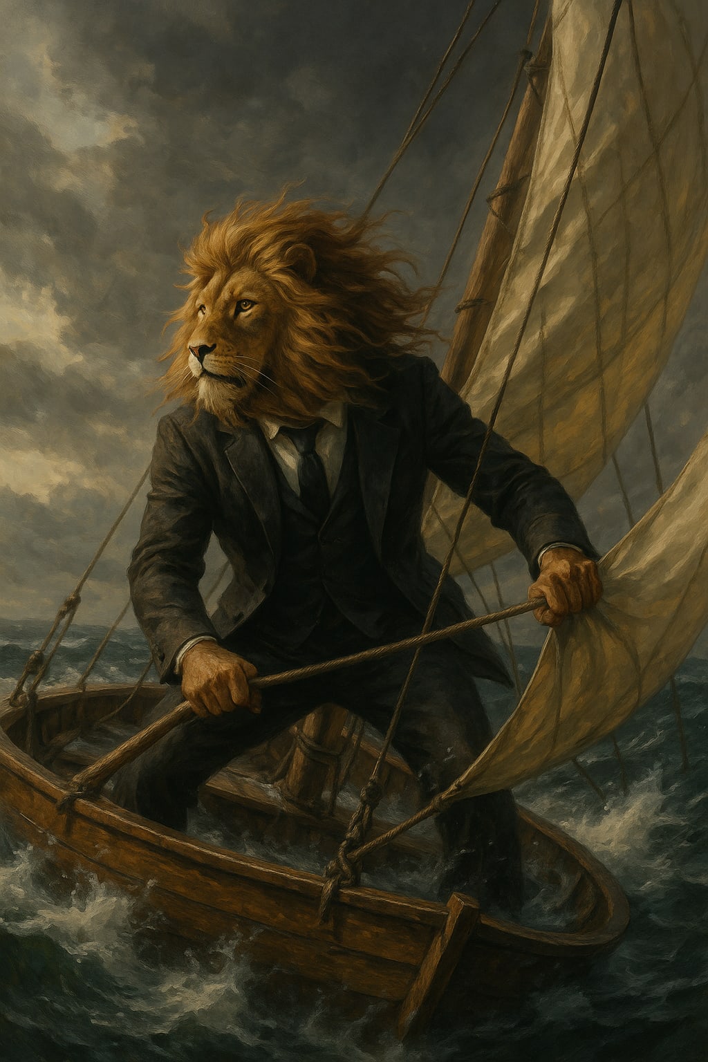But standing alone on a fragile wooden boat caught in the middle of a roaring sea.