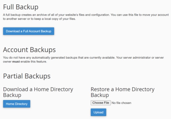 Your web host can offer automatic cPanel backup functionality, depending on the plan and the host you choose.After logging into your hosting panel, you will find a variety of tools divided into categories. Look for the Backup Manager option. If you can’t find it, check the Files category.