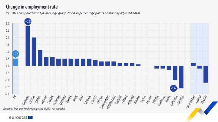 Changes in the employment rate between Q4 2022 and Q1 2023 varied across the EU countries for which data were available. The highest increases were recorded in Bulgaria (+2.8 pp), Croatia (+2.0 pp) and Cyprus (+1.1 pp).
