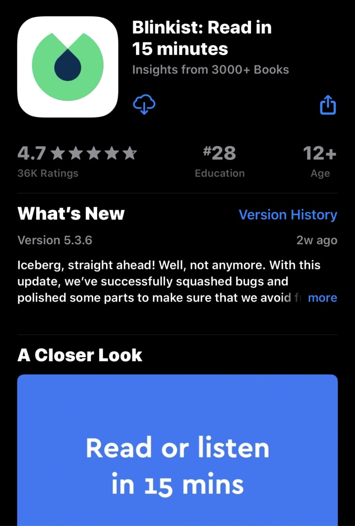 The Blinkist is like the cliff notes. You can get the principle concept and points the author was making in a 15 minute summary which you can either read or listen to.