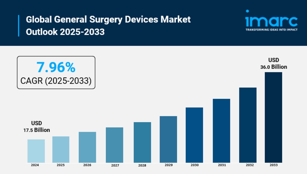 The global general surgery devices market size reached USD 17.5 Billion in 2024. Looking forward, IMARC Group expects the market to reach USD 36.0 Billion by 2033, exhibiting a growth rate (CAGR) of 7.96% during 2025-2033. The increasing prevalence of different surgical conditions, advancements in surgical techniques, and the rising number of ambulatory centers represent some of the key factors driving the market.