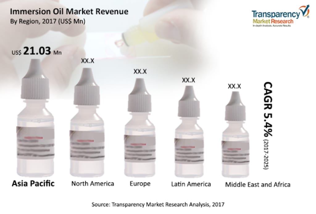 The global immersion oil market was valued at around US$ 55 Mn in 2016 and is anticipated to Transparency Market Research (TMR) titled ‘Immersion Oil – Global Industry Analysis, Size, Share, Growth, Trends, and Forecast, 2017–2025.’ Expansion of the global immersion oil market is driven by the rise in demand from diagnostics laboratories and pharmaceutical & biotechnology companies. The immersion oil market in Asia Pacific is expected to expand at a CAGR of more than 6% during the forecast period. Innovations in microscopy sciences and the rise in usage of microscopes in life science and the health care industry are likely to propel the immersion oil market in the region.