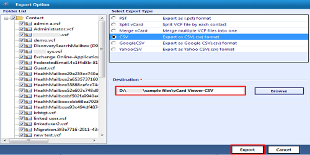 - Once you’ve set your destination and reviewed your options, you’re ready to Export the VCF file to CSV.
