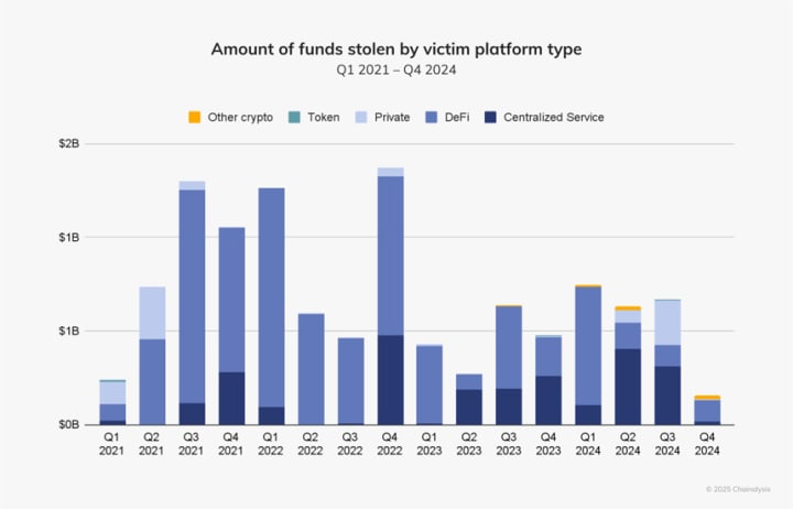 3. Security & Audits: DeFi accounted for a huge fund loss due to security compromises in Q4 2024, as per the report by Chainanalysis (the snapshot below). Security is therefore non-negotiable for dApp development, handling financial value, and critical user belongings.