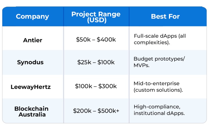 To give you a real-world sense of cost, here are examples of reputable dApp development companies and their estimated project cost in 2025.