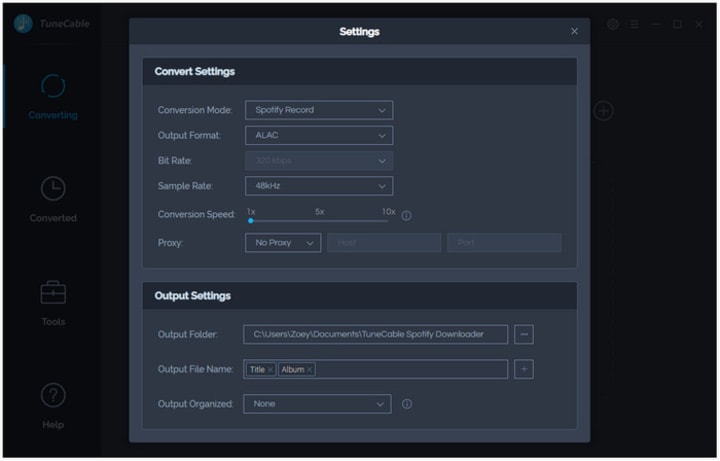 Now, you need to set your output settings for music conversion. TuneCable Spotify Music Converter can convert Spotify Music into MP3, WAV, FLAC, AAC, AIFF & ALAC formats. However, the highest audio quality will be 320kbps. Just click on the “Setting” button and you’ll get a pop up window where you can set the output format, output folder, file name, output quality, speed, etc.