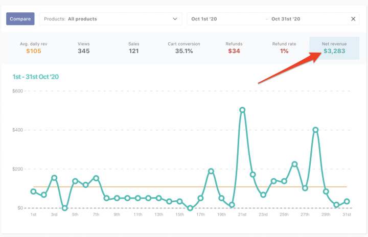 Well, in the image below, you’ll see the earnings from the sale of digital products from those 7,000 pageviews: