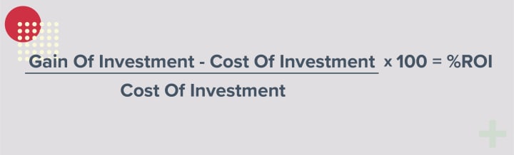The formula for ROI is: Gain of investment - cost of investment / cost of investment x 100 = % ROI.