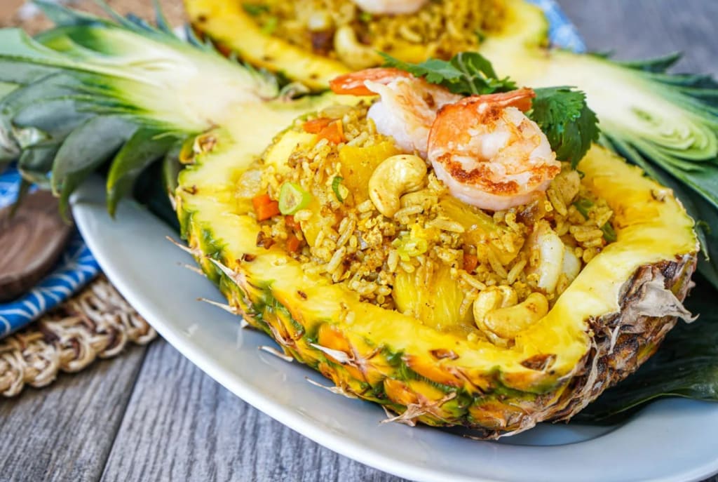 The dish's presentation is as unique as its name suggests. Unlike typical Thai fried rice served on a plate, this dish is presented in a hand-carved, fresh pineapple bowl, offering an impressive visual to those unacquainted with Thai cuisine.