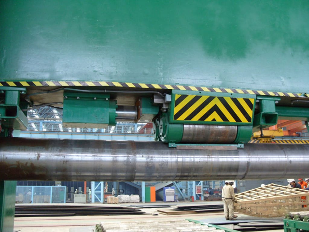 The shipboard rolling mill adopts a three-roll symmetrical structure. The upper roller moves vertically at the center symmetrical position of the two rollers. The hydraulic drive is realized by the effect of the oil in the cylinder on the position. The two lower rollers rotate and provide torque for the plate through the meshing of the gear of the reducer and the gear of the lower roller. Multiple sets of support rollers are designed on the underside of the two lower rollers to enhance the rigidity of the lower rollers and can be adjusted vertically. On the upper side of the upper roller, there is a rigid beam. In addition, multiple sets of support rollers are arranged between the beam and the upper roller to improve the rigidity of the upper roller. The machine is suitable for bending of curved and over-wide workpieces.