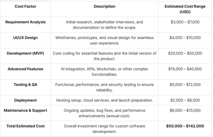 The cost of Custom Software Development varies depending on complexity, features, tech stack, and team expertise. The Below table shows a general cost breakdown to help businesses estimate investments for tailored solutions.