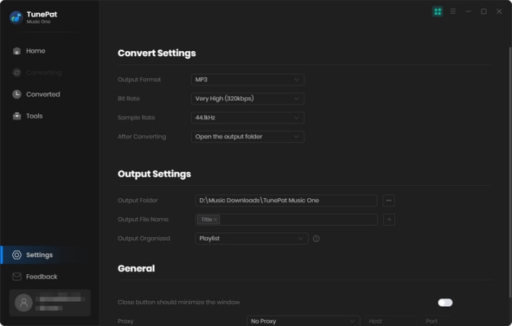 As a mature music downloader, TunePat Music One offers you flexible settings and handy tools that other music converters do not have. TunePat Music One is a comprehensive program more than a music downloader. It offers you the settings to select an output format, sound quality, and output folder, name the output files as needed, and decide how to classify output files. Different users have different needs. To meet most of your needs, TunePat provides options such as title, artist, album, track number, playlist index, and year to the output file name settings, and offers playlists, albums, artists, and more options to the Output Organized. You can get yourself satisfied with so many options.
