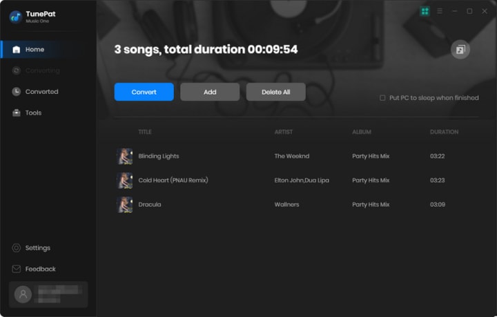 To begin downloading the songs, simply click on "Convert". And TunePat will convert the songs at up to 10x the speed with the original quality saved.