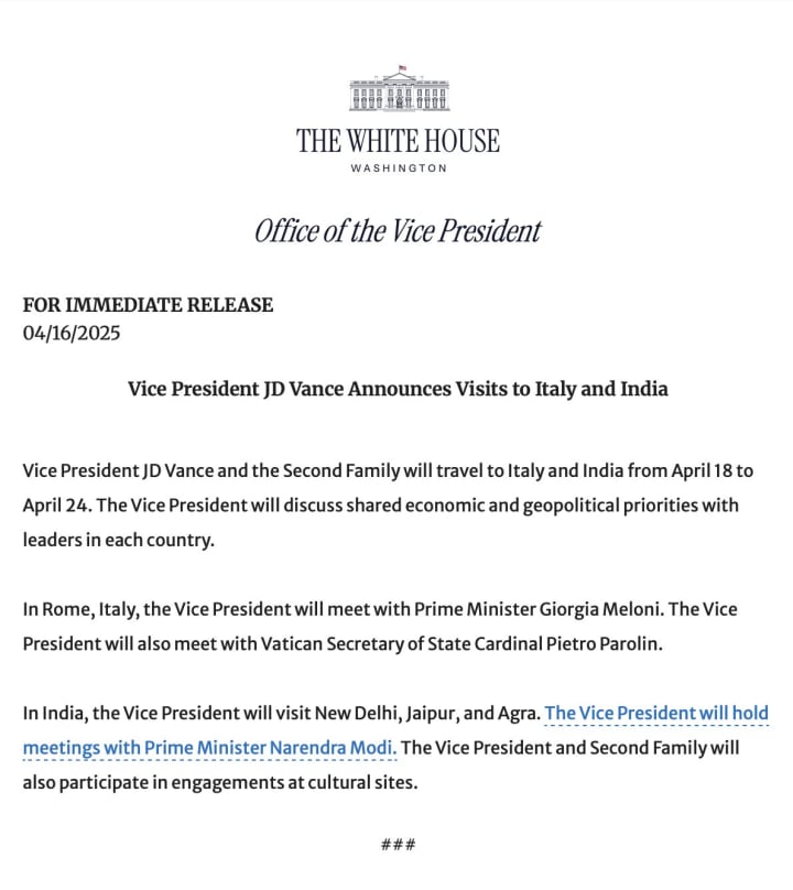 JD Vance and his family will also visit Italy April 18 to 20, before reaching India.