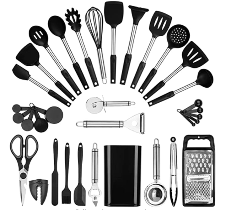 The Stainless Steel Utensils Set : is a 35-piece cooking essentials set that includes everything you need to prepare perfect dishes. This set comprises of silicone cooking spatulas, spoons, turners, skimmer, ladle, and measuring cups and spoons, along with other stainless steel function gadgets. The high-quality silicone heads of these cooking tools prevent scratching and damage to non-stick cookware. The 430 stainless steel handles are durable and solid. All of the silicone spatulas are crafted from food-grade silicone, ensuring safe cooking. These non-scratch silicone heads pair great with expensive non-stick pans, pots, and bakeware, thereby extending their life. The utensils are easy to clean and store as they are fast, simple, and dishwasher-safe. They feature small holes on the handles, enabling you to hang them and save storage space in your kitchen. This stainless steel utensils set is perfect for anyone who wants to cook professionally or to make cooking a more enjoyable experience.