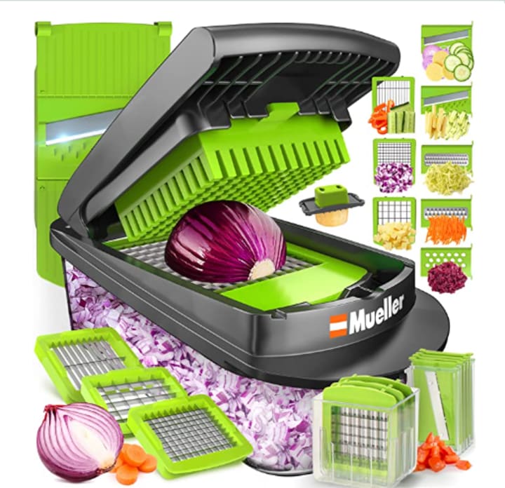 The Blade Vegetable Slicer : is a highly functional kitchen gadget that can alleviate prep time to just a couple of minutes. Made with premium materials like grade 420 stainless steel blades and food-grade BPA-free materials, it's the perfect tool to make home-cooked meals easier and faster. With 8 diverse blades, including three different-sized chopper blades and 5 interchangeable blades for slicing, julienne, grating & shredding, this tool offers the functionality of multiple kitchen tools in just one, highly versatile gadget. Its innovative design includes a food container that frees up countertop space, a food holder that prevents food from slipping while slicing, and easy dishwasher cleaning. By making food prep less time-consuming, this tool encourages healthier eating habits, making it easier to add vegetables to meals and avoid unhealthy fast-food options. Overall, the Blade Vegetable Slicer is a must-have for any kitchen looking to save time and improve health.