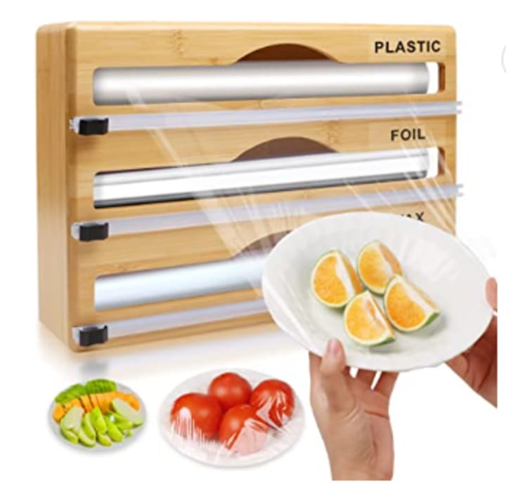 The Foil Plastic Wrap Dispenser : is a multifunctional kitchen tool that solves 90% of the trouble associated with kitchen organization. It helps you store and cut wraps easily, making your kitchen clean and tidy. This plastic wrap dispenser with a cutter is compatible with various brands of plastic wrap and aluminum foil, making it an essential kitchen gadget. The bi-directional cutting slide is designed to prevent self-cutting and rusting, making it safe to use. With 21pcs wrap labels, this countertop organizer helps keep your kitchen more orderly and neat. Made from natural high-quality bamboo wood, this dispenser is drop-resistant and robust, and devoid of chemical contaminants, waterproof, and moisture resistant. With upgraded features like rounded corners, and integrated technology, this Foil Plastic Wrap Dispenser is a must-have for any kitchen looking to improve its organization.