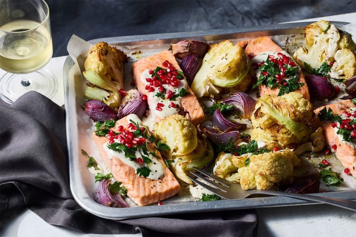 Cauliflower and salmon traybake with tahini sauce: