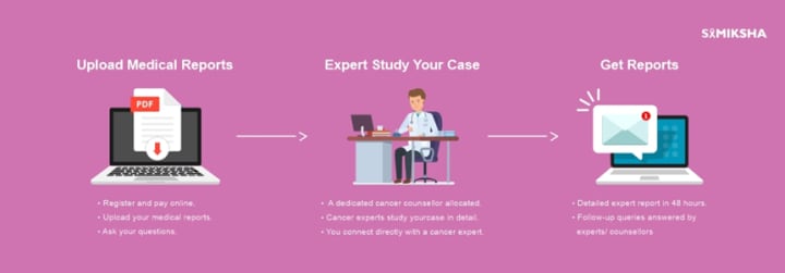 Cancer Samiksha is a comprehensive cancer care ecosystem that provides you with all the cancer care services from diagnosis to post-cancer care. With Samiksha seeking an online second opinion is an effortless process. The person has to register on the website- https://www.cancersamiksha.com/ and he is allotted with cancer counsellor after the registration process.
