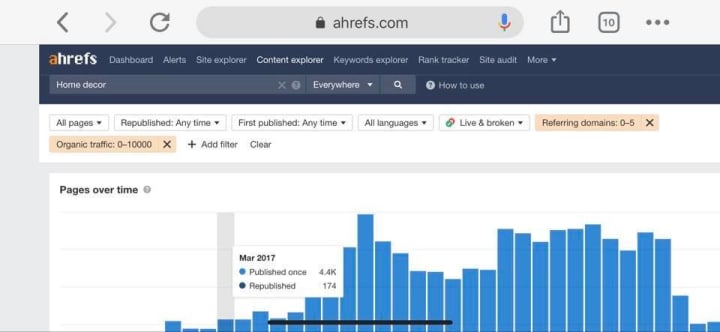 - Here comes the main part. Content Explorer allows you to add certain filters. You can use those filters to find out low competition keywords. For example, set referring domains between 5-10, similarly, do with the DR to find new sites. You can set organic traffic, and many other things according to your niche.