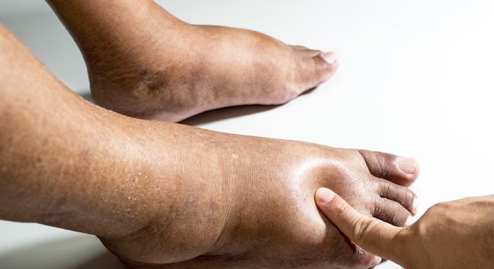 Edema is swelling caused by excess fluid trapped in your body's tissues. Because the kidneys aren't fully functioning they don't remove excess fluid from the body, which can cause swelling in the ankles, feet, and hands.