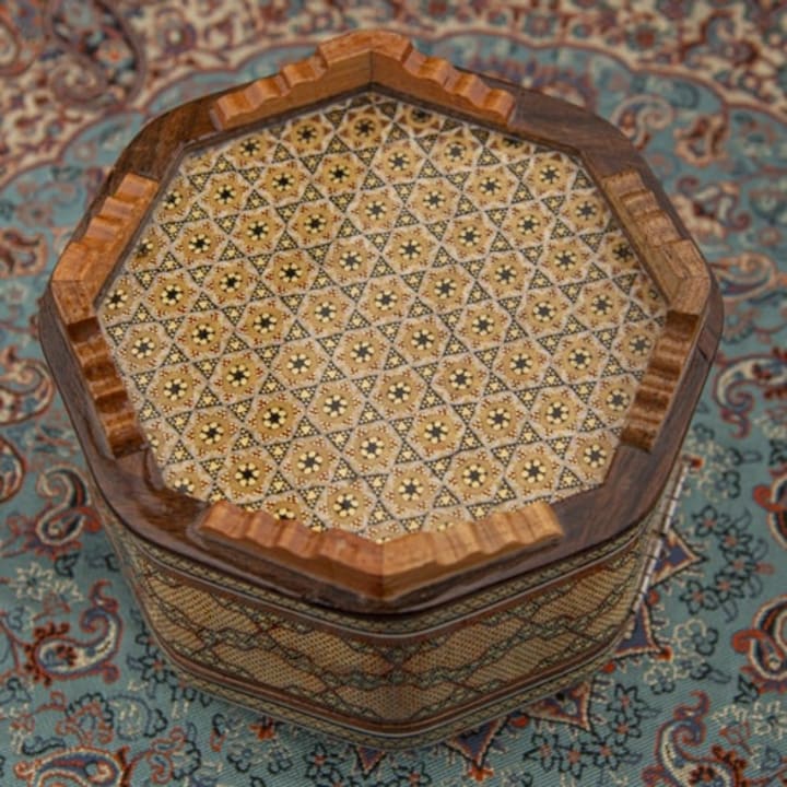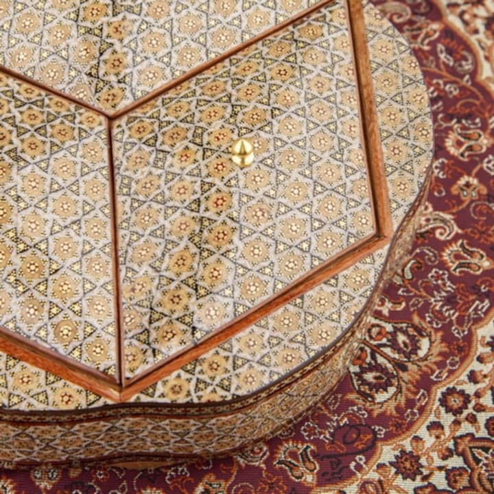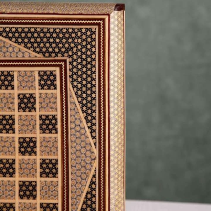 Khatamkari is a traditional Persian art form that involves the inlaying of small pieces of wood, bone, metal, and sometimes even ivory, into geometric patterns on a wooden base. The patterns are created by arranging and gluing the pieces of material together in a specific order, creating a mosaic-like effect. The end result is a stunning piece of art that is both beautiful and functional. Khatamkari is used to decorate a variety of objects, including boxes, frames, furniture, and musical instruments.
