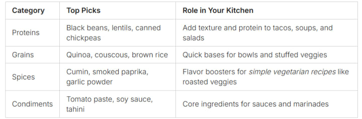 Turn your kitchen into a place for healthy vegetarian meals with these key pantry items. You don't need fancy stuff. Just make smart choices that add flavor and nutrition quickly.
