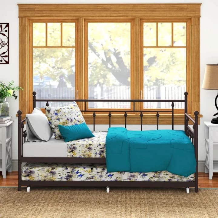 This daybed adds versatility and sleeping space to your guest room, home office, or children's room. It has a powder-coated iron frame with an openwork design and slender spindle embellishments for a traditional farmhouse appeal. This piece's solid surface allows it to mix in with a wide range of color schemes and designs. If you have many overnight guests, a moveable trundle bed underneath provides an extra sleeping space. What we particularly like about this metal bed is that it comes with slat kits, which eliminates the need for box springs.