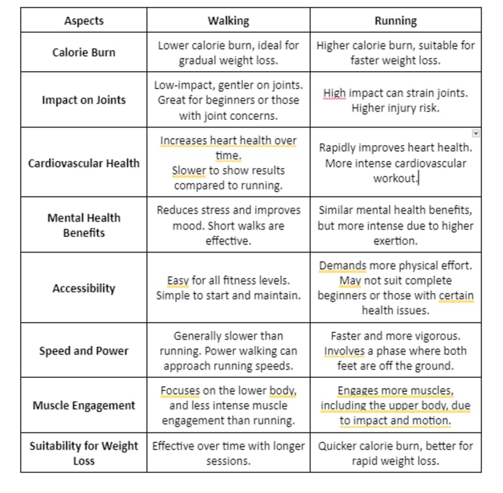 When comparing walking and running, it's clear that each has its unique benefits. Below is a chart to show how they compare —