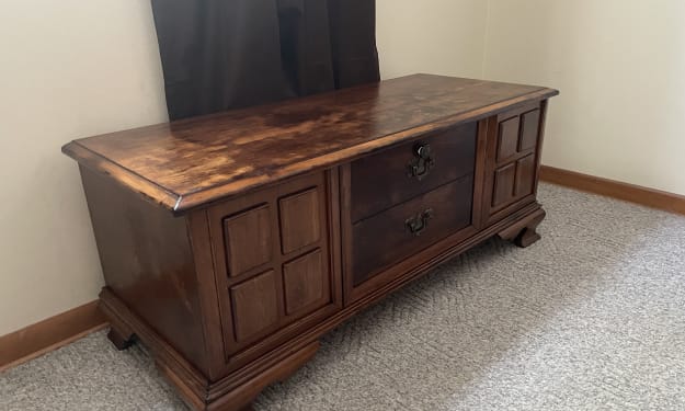 About a month ago, I spotted a pretty beat-up but still beautiful cedar chest at our local Good Shepard store. Made by Lane Co. of Altavista, Va. probably about a hundred years ago, it has the Aroma-Tite seal that doesn’t betray expectations: The chest still smells like cedar.