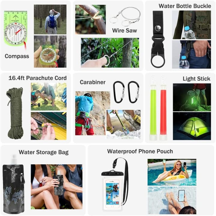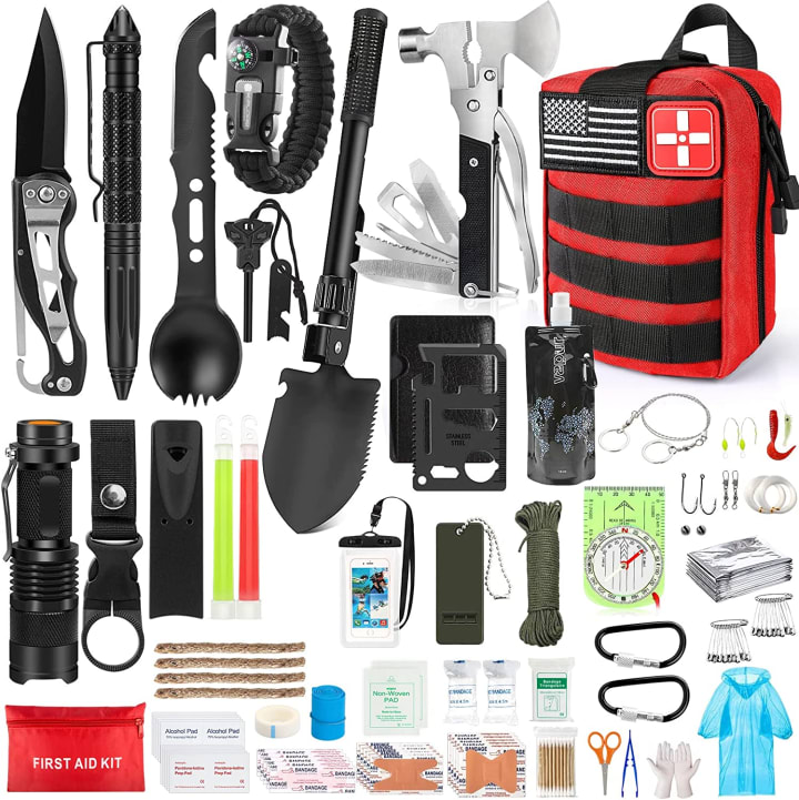 This emergency kit contains the most popular survival necessities such as a multitool axe, f*lding shovel, tactical knife, 3-mode tactical flashlight, saber card, multi-function survival bracelet, parachute cord, emergency blanket, comprehensive first aid kit, and much more. All these gears can ensure that wounds can be treated in time to prevent infections, allowing you to treat a single family or a group of friends in emergency situations.