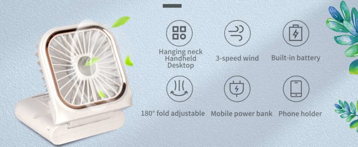 This compact and versatile personal fan keeps you cool wherever you go! With its small and foldable design, this fan easily fits in your pocket or backpack, making it perfect for travel, camping, and everyday use. Use it as a handheld fan, or mini desk fan, or even hang it around your neck with the removable and adjustable lanyard for hands-free convenience while shopping, hiking, or enjoying the beach. But that's not all - this fan also doubles as a power bank with its 3000mAh rechargeable battery and USB output port, allowing you to charge your phone in case of emergencies. Plus, it features a hidden mobile phone holder, keeping your hands free while you work, attend meetings, or indulge in your favorite shows.