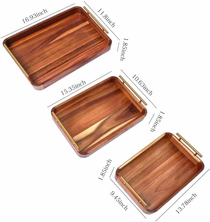 The Wood Serving Tray is a versatile and functional accessory that can Add a touch of rustic charm to your kitchen decor. Made of natural acacia Wood of high quality ,these trays are lightweight yet durable, making them perfect for serving food and drinks. The sturdy metal handles provide safe and secure transportation, while the non-slip mats ensure Perfect stability and avoid scratches on your furniture. With a Nesting Stackable design, the three Different sizes of trays are easy to store together, saving you space in your kitchen. These trays can be used not only for serving breakfast, dinner, drinks, cheese, cake, or any food Daily, but also as decorative trays in the dining room, living room, or kitchen. The Vintage look of the trays is sure to impress your guests and make your home unique. Cleaning is easy, and these trays make a great gift idea for any occasion, including housewarming, weddings, Christmas, birthdays, Thanksgiving, and anniversaries.
