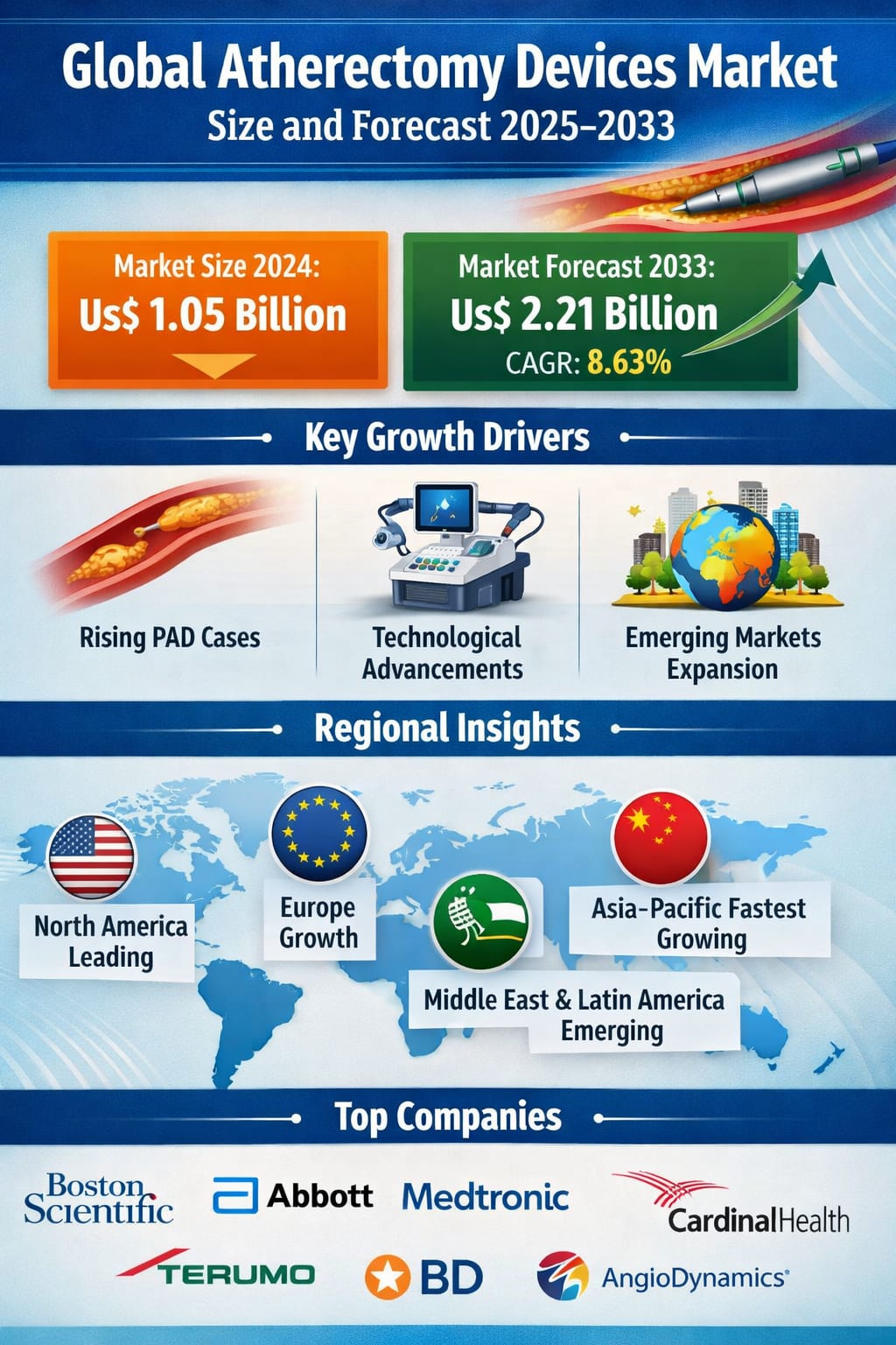 Looking ahead, the atherectomy devices market is poised for sustained growth through 2033. The combination of rising cardiovascular disease prevalence, continuous technological innovation, and expanding access to healthcare in emerging markets creates a strong foundation for long-term expansion.