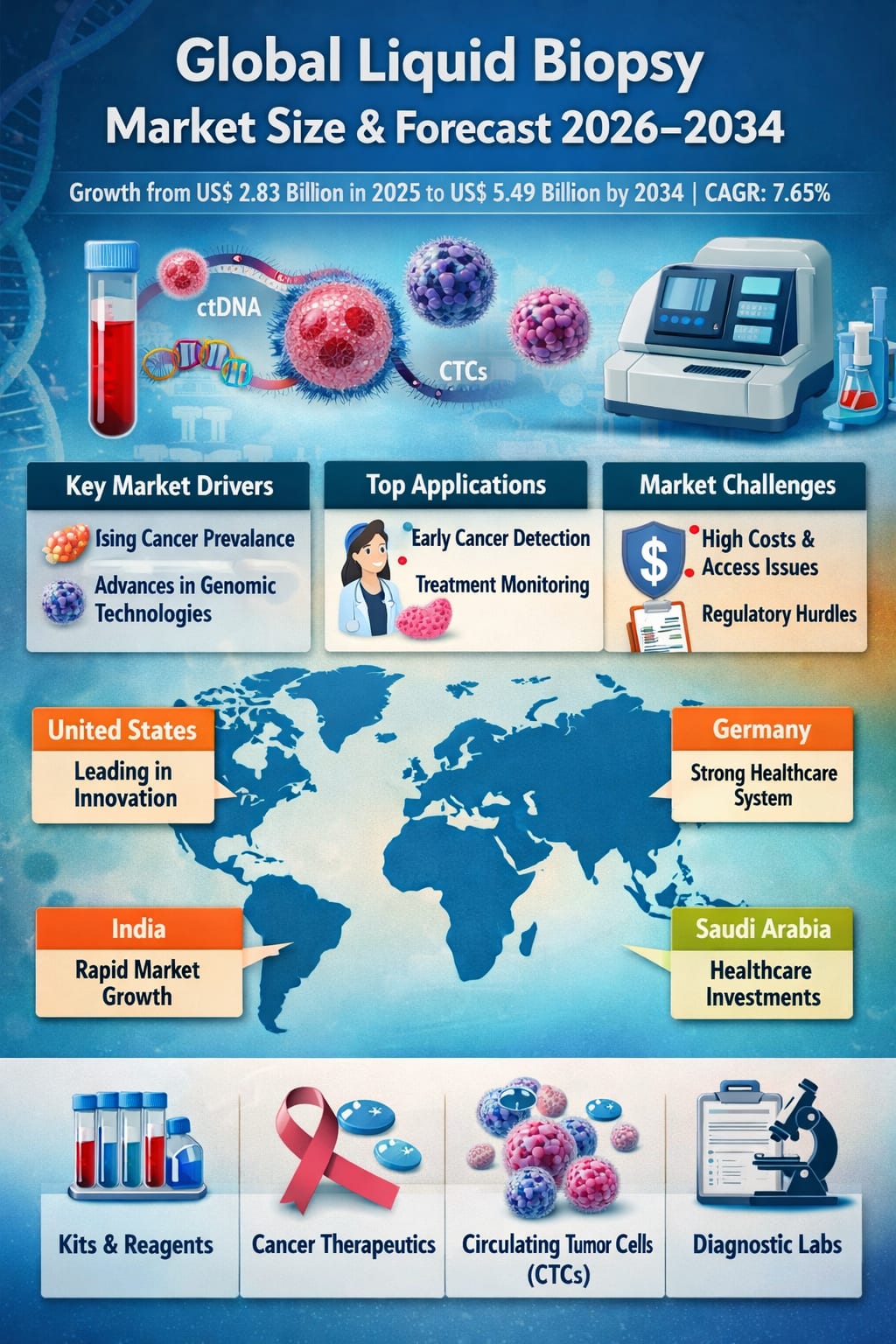 The global healthcare landscape is undergoing a profound transformation, driven by the convergence of biotechnology, genomics, and data-driven medicine. Among the most promising advancements in modern oncology is liquid biopsy—a minimally invasive diagnostic approach that is redefining how cancer is detected, monitored, and treated. Unlike conventional tissue biopsies, liquid biopsy relies on analyzing biomarkers such as circulating tumor DNA (ctDNA), circulating tumor cells (CTCs), exosomes, and other nucleic acids found in body fluids, primarily blood.
