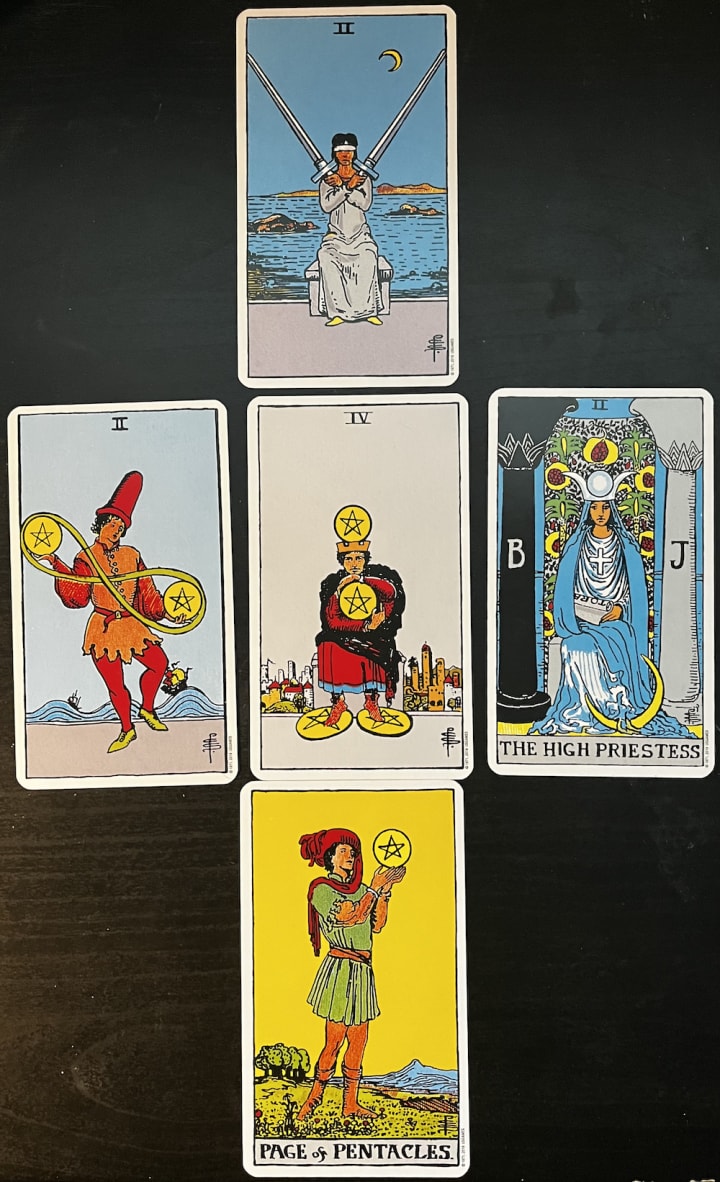 Welcome friends. As I progress in my tarot readings, I’m starting to look for new things, and one idea that struck me was to do a reading for the week ahead. So I asked my question: What do the cards show us for the week ahead? I shuffled, and four cards fell out as a pack. At first, I arranged them in the order they fell in my usual three-card spread. But that would mean I’d have to omit the fourth card. I started to do that and then got the message that I should read this as a cross instead. I pulled a fifth card to finish the cross, and at the end, we’ll do a takeaway as always.