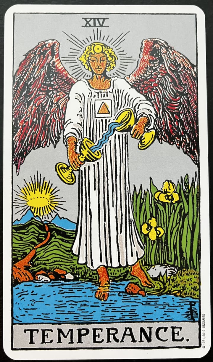 Our takeaway card for the week is Temperance. It shows an angel with one foot in the water and one foot on the land. She holds two cups and mixes water from one cup with the other.