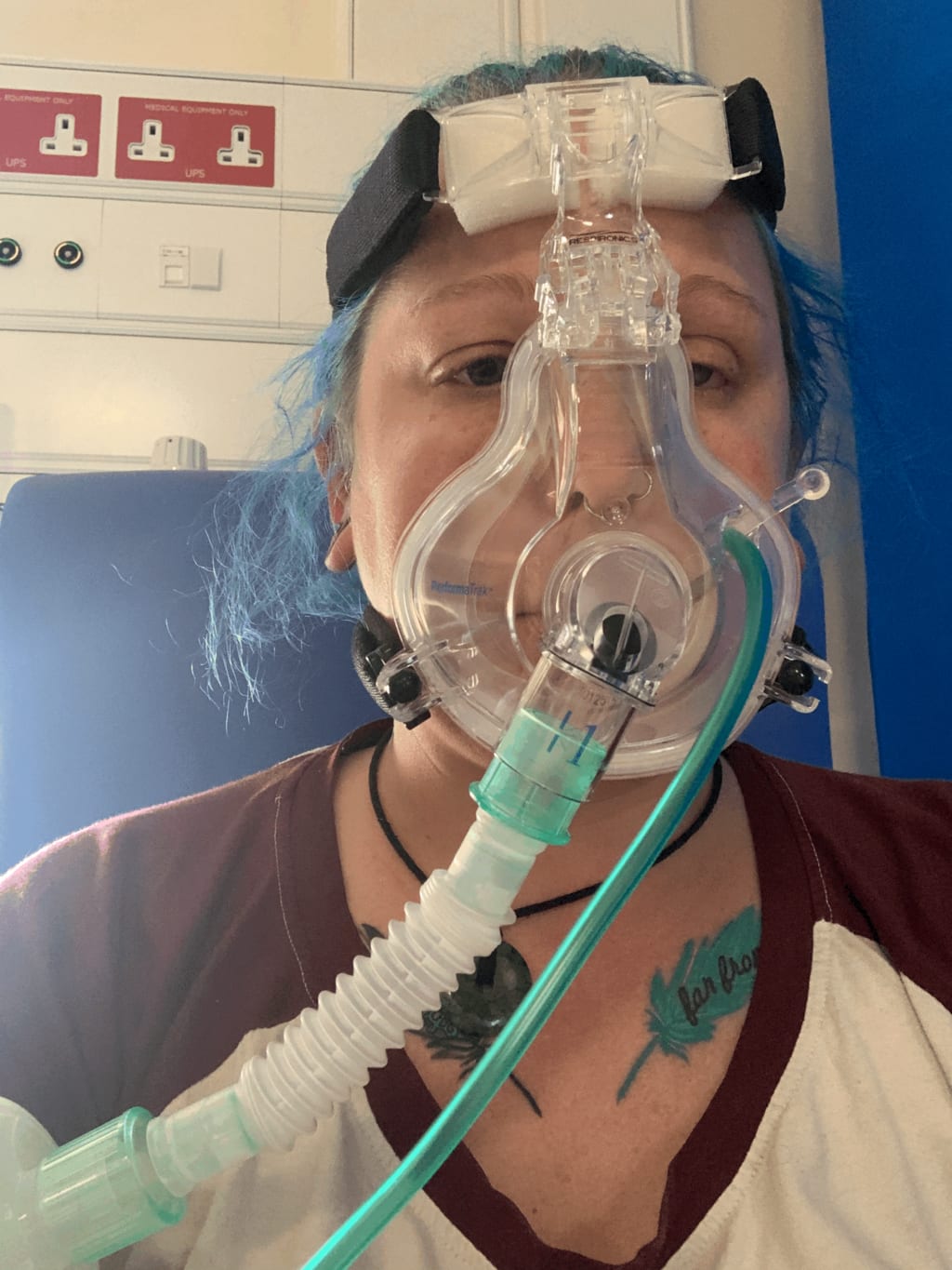 A little later, getting on towards midnight, the two staff came to me with the CPAP machine. It was unceremoniously fitted to my face with very little in the way of explanation and then they walked off and left me to it. The CPAP machine creates positive air pressure to force air into the lungs and keep them from collapsing. Unfortunately, my lungs and I were so exhausted by this point that I didn't have the strength to breathe out against the air being forced into my lungs, and if you can't breathe out, you can't then breathe in. I was essentially drowning in air. The mask was rigid and uncomfortable, obscured the vision in my only eye and dug in painfully where it had not been fitted properly. Sat alone in a hospital bed with no instructions or reassurance, I panicked. I had flashbacks to an abusive ex partner and lost all sense of reality, forcing them to take the CPAP off and give me back my mask. The attittudes of the staff towards me only worsened after this. Another night passed with no sleep.