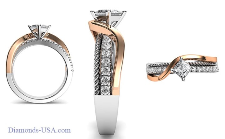 Textures and gold colors, woman engagement ring, set with Princess cut, image, Diamonds-USA