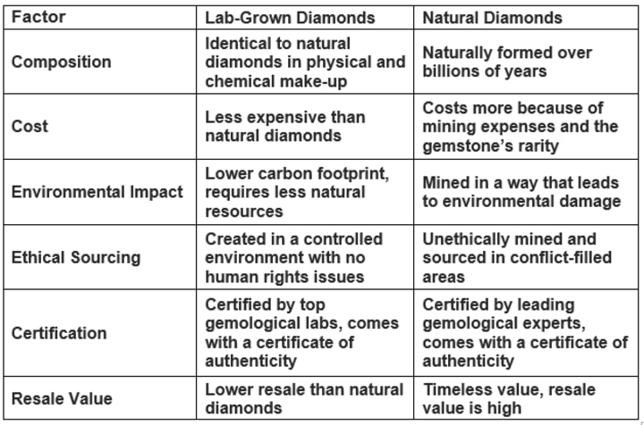 As more people become aware of the downfall of the diamond industry, more couples have to decide between lab-grown and natural diamonds. Let’s dive into these choices using a comparison. As the demand for ethical and sustainable choices grows, many couples are faced with the decision between lab-grown and natural diamonds. This table highlights key differences and will empower you to make the right decision for your engagement ring.