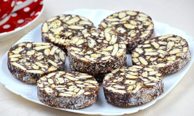 Sausage biscuits Biscuit salami is an Italian and Portuguese dessert made from cocoa, crumbled biscuits, eggs and butter. Traditionally, alcoholic beverages such as rum or Port wine are also used to prepare biscuit salami. The dessert has no meat in its composition, and its name is due to the shape in which it is prepared and the pieces of biscuits inside that resemble a slice of salami.
