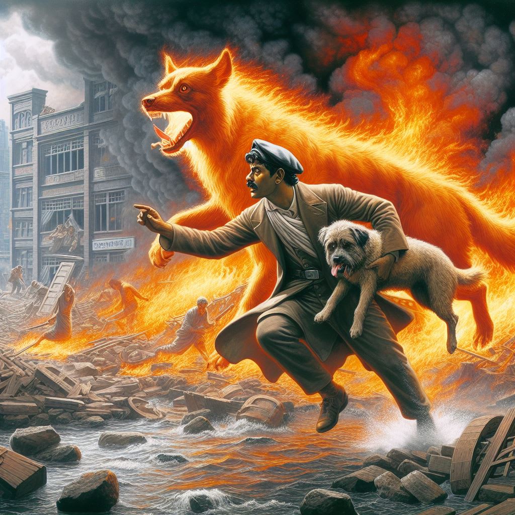 Drawing upon reserves of strength he never knew he possessed, Mr. Smith rallied his courage for one final push. With Goldie by his side, he plunged into the raging inferno, his mind focused on one thing and one thing alone—survival.