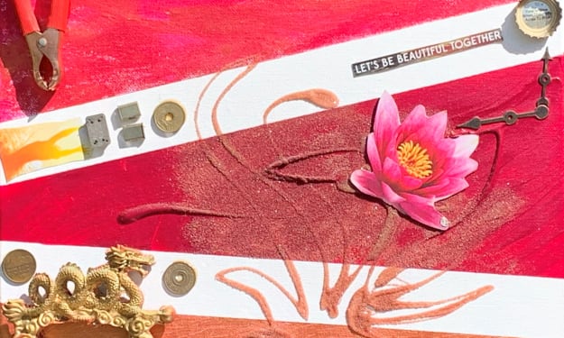 Through the process of making this collage, I gathered favorite maps, stickers, jewels, found objects, and parts, and made them better with scissors that helped me to craft them in the shape of each letter. Some materials are extra thick and needed the power of Fiskars to shape them to the curves and length of each letter. I particularly enjoy making collages on holidays, and this one was completed on Thanksgiving. Scissors, industrial glue, markers, and an openness to unlock my creative expression are the tools of my trade. Then it is all about stepping into the flow of where the materials speak to me for placement and giving the viewer surprises by flipping items on their head or creating unique geographies with their placement.