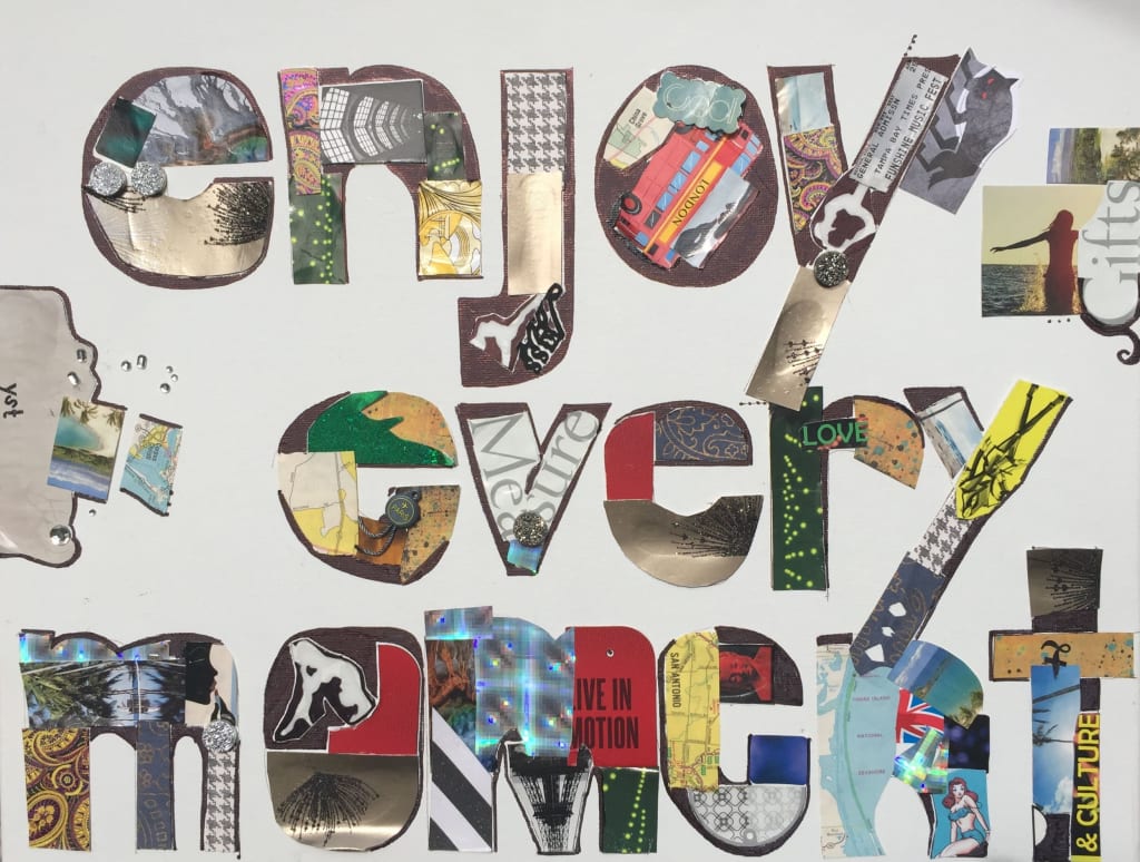 Collectively, each letter becomes a part of a greater whole, inspiring onlookers to enjoy every moment. Tune in to things small and big to find the joy in even the most basic things and your life will change for the better beyond measure. Seeing and being from this upgraded lens is a gift we can all attain.