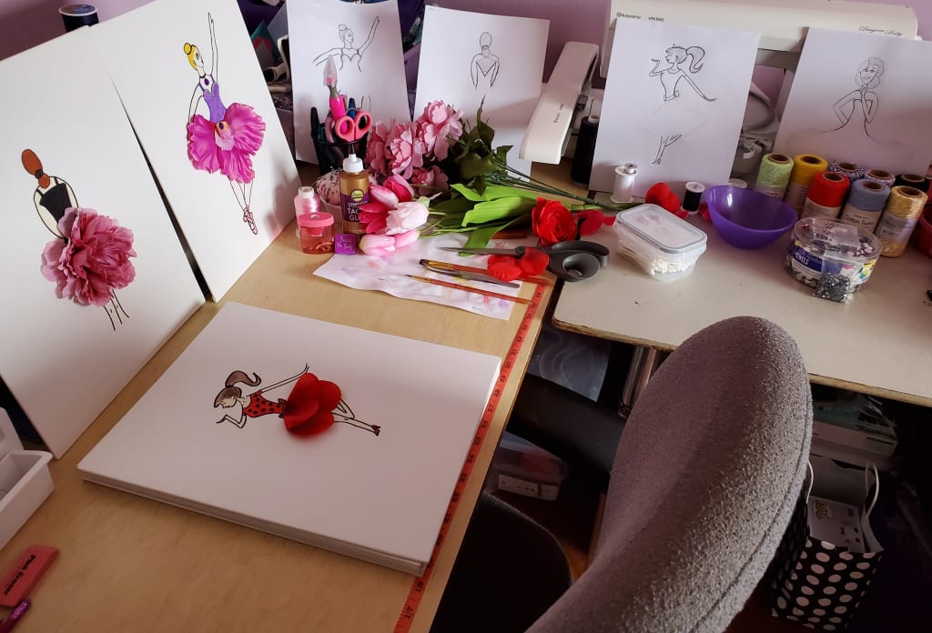 I sat there in my room silently for a bit. Slowly turning about in my chair as my husband happened to walk down the hall and catch my thoughtful glare. “Oh, lord….” He knew. Well, he didn’t know the details, but he knew it was going to be something elaborate. He just stood there leaning in the doorway staring, waiting for me to turn and let him in on the big plans I was undoubtedly making. Mind you, at this point, I had no real idea what I wanted. I just knew I wanted it and I wanted it now. Color, whimsy, personality overload. It had to be flashy, and unique. Artwork! Not just any artwork. Something with real pop. I set to google image search as I often do when I have an idea of what I want but need to come up with some inspiration and I keyed in “Custom Fashion Art” and scrolled forever. Beautiful piece after beautiful piece appeared before my eyes. All pristine and perfect. But not really anything that screamed out to me. Nothing that was really ME. Until I saw this one tiny image of a barely even brush strokes body with flower petal skirt and I could feel my eyes light up! I fell in love! I searched out more like it and could not have been more in love. I showed my daughter and she lit up like a Christmas tree. This was it for sure - but I couldn’t find anyone who made them on commission. This was a huge dilemma for me as I am no painter and my drawing talents … let’s just say I have never won a game of Pictionary in my life. I was heartbroken not to be able to find anywhere to purchase them, but my sweet girl just kept telling me she knew I could do it. I swear that girl genuinely believes I can do anything. And for her, I would absolutely try my hardest!